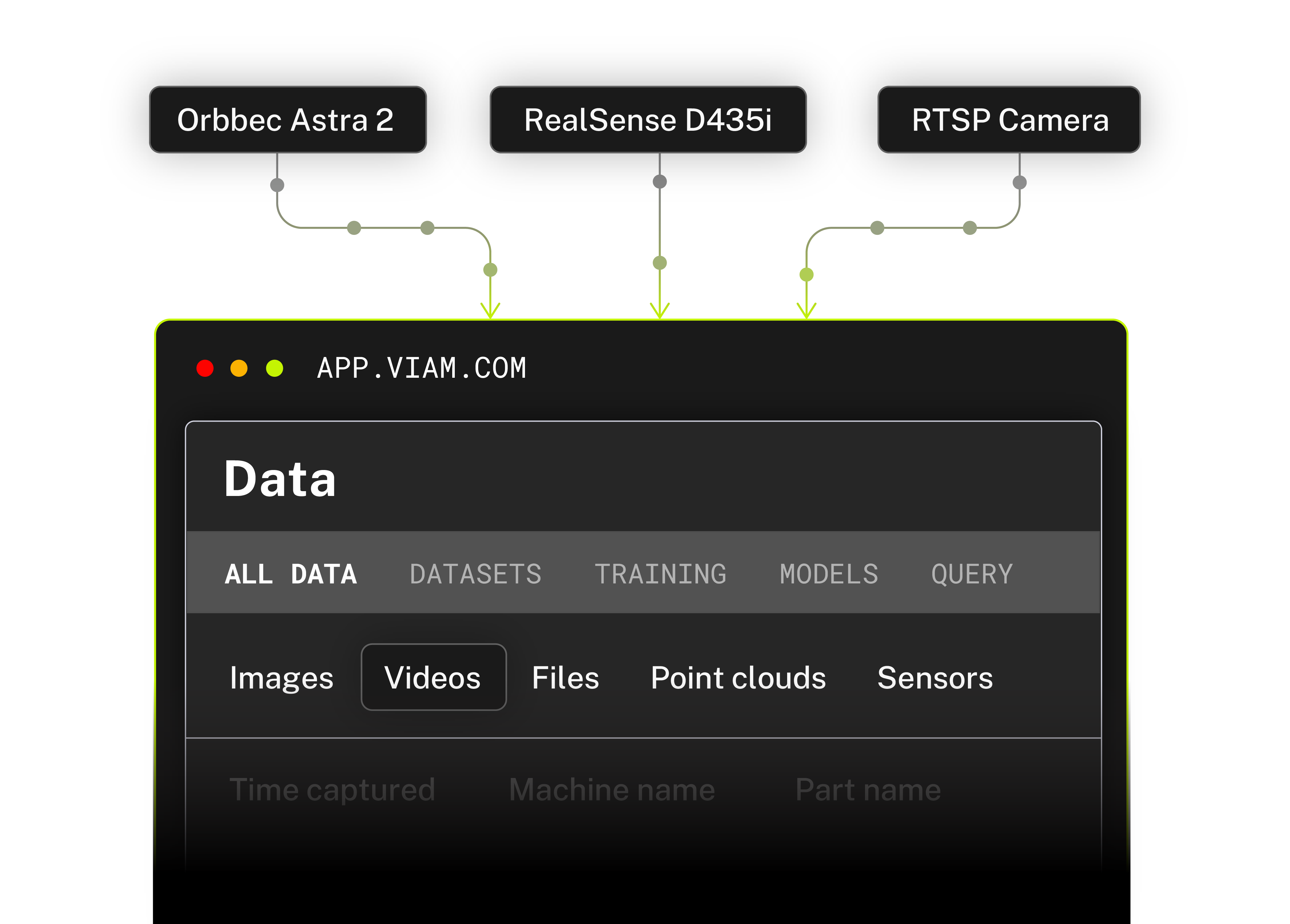 Declare what you want to capture in a JSON config. Viam handles ingestion, edge buffering, and cloud sync, no custom pipeline required.
