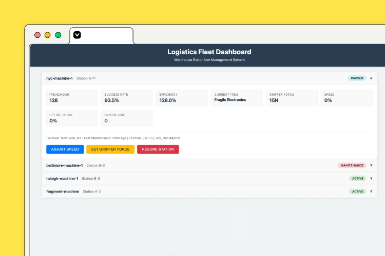 A sample fleet dashboard created using Viam Apps, complete with live fleet health metrics for all machines in the operator’s assigned fleet and simple actuation commands.