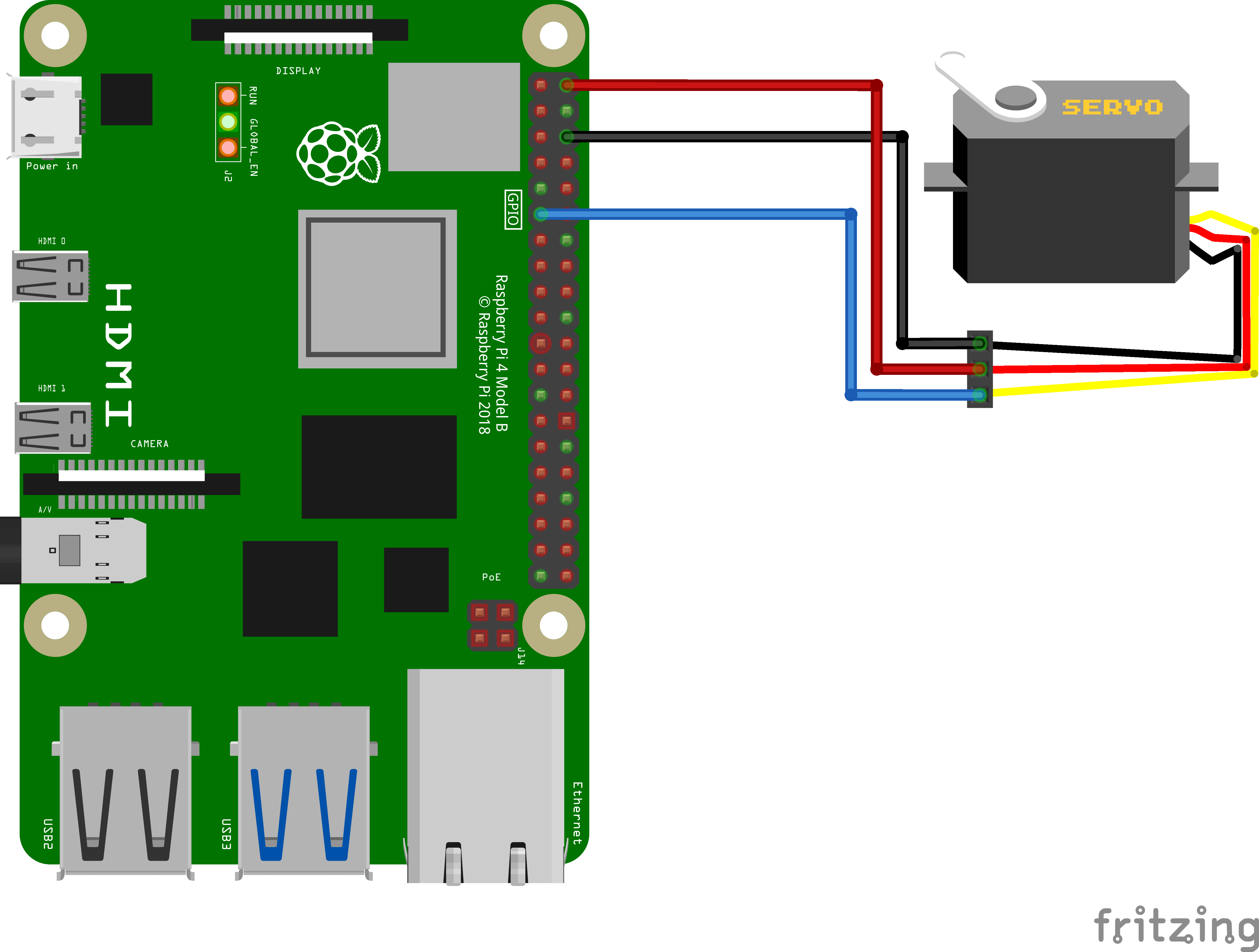 Your servo has three wires. Connect them to the Raspberry Pi GPIO header using jumper wires: