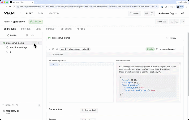 - Add data capture — Log servo positions over time with Viam data management