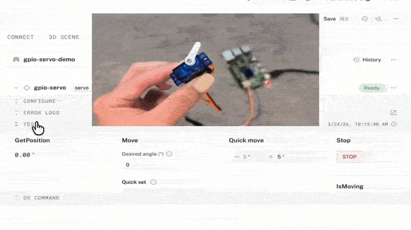 You'll wire a micro servo to a Raspberry Pi, configure it as a servo/gpio component in Viam, and use the built-in TEST panel to move it to any angle you want.