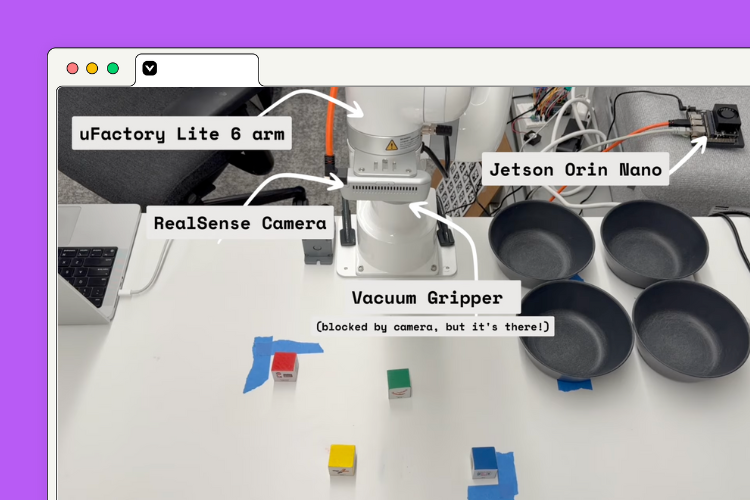 Build an intelligent cube-sorting robot entirely on Viam, which can detect colored cubes and place them into corresponding bowls using computer vision and motion planning. This tutorial walks you through configuring a uFactory Lite 6 robotic arm with Viam, leveraging pre-built fragments and ML models to get your robot sorting in minutes. You'll also create a custom web app to control your robot from anywhere.