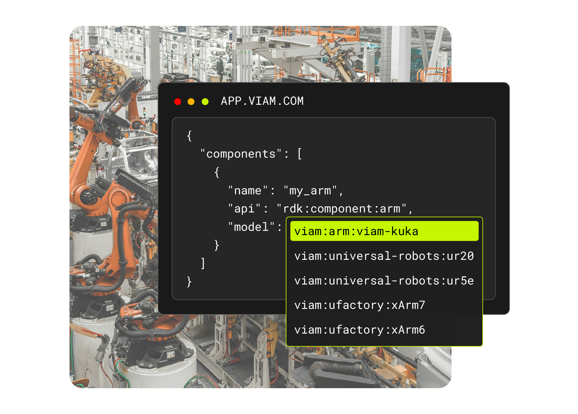 Your floor runs equipment from multiple vendors. Viam connects them through a single API — arms, cameras, sensors, edge compute — regardless of manufacturer. Add new hardware with a config change. Replace a component without rewriting your application. No vendor lock-in, no stranded investment.